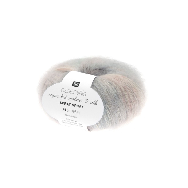 Essentials Super Kid Mohair Loves Silk Spray est la version imprimée du fil uni très apprécié. Ce mélange de mohair super kid et de soie de haute qualité présente un subtil motif à rayures. Sa teneur en soie (30 %) lui confère une légèreté exceptionnelle, idéale pour les châles et écharpes délicats.