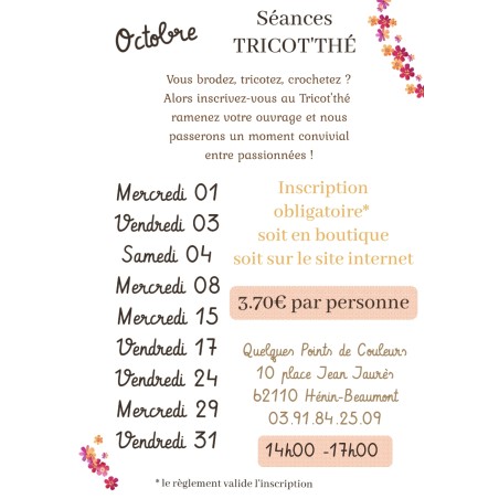 Une boisson chaude ou froide (selon la saison) et une petite douceur accompagneront de moment convivial, papotage, et rigolade sont de la partie. Attention, ce n'est pas un cours !