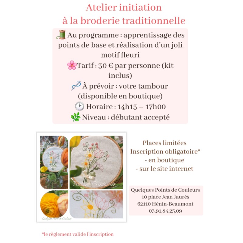 Au programme : apprentissage des points de base et réalisation d'un joli motif fleuri ( que vous terminerai chez vous)