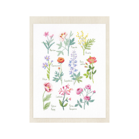 Kit de broderie pour le point de croix comprenant tout ce qu'il faut pour réaliser ce tableau printanier .